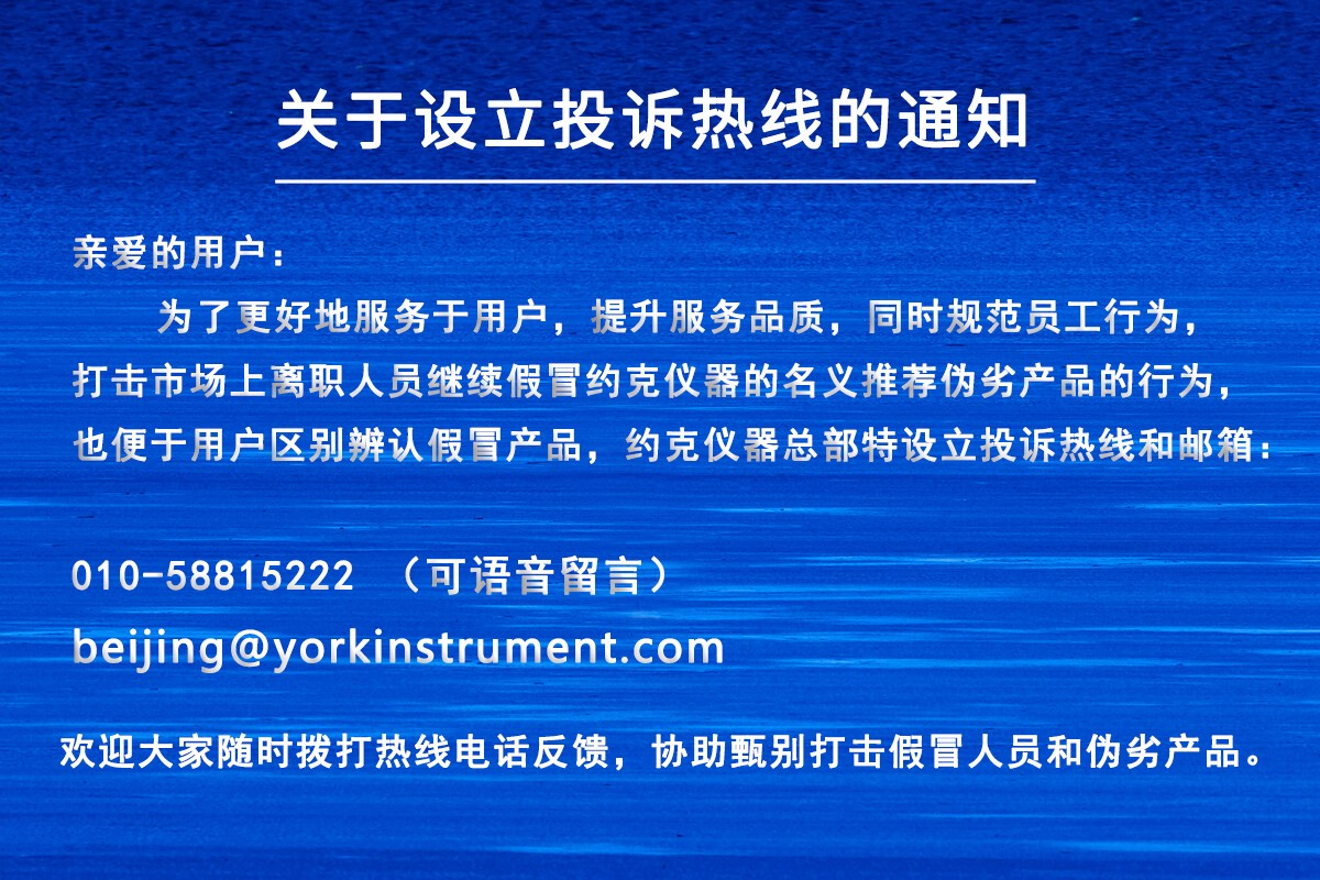 为了更好地服务于用户,提升服务品质,同时规范员工行为,打击市场上离职人员继续假*约克仪器的名义推荐伪劣产品的行为,也便于用户区别辨认假*产品,约克仪器总部特设立投诉专线和邮箱: