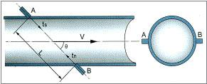 基于超声波在管道中传播时间的原理。在管道中斜装的一对超声波换能器之间的距离为超声波的传播声程。超声波在两个换能器之间的顺流传播时间和逆流传播时间分别为: