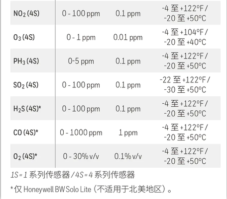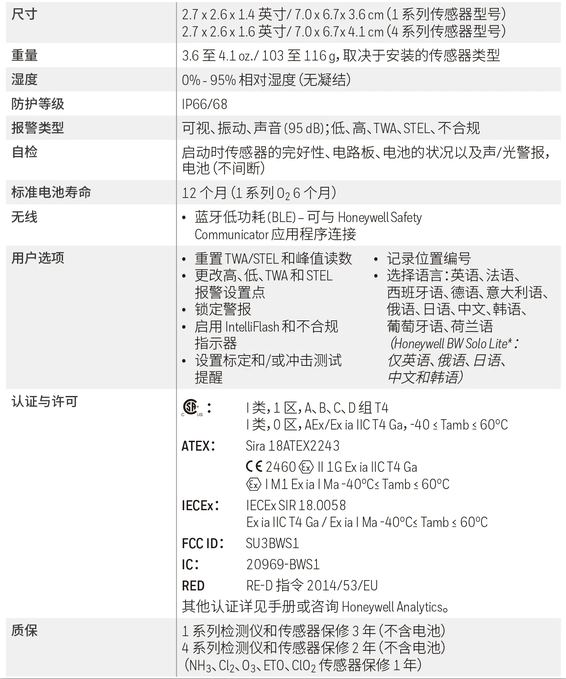 Honeywell BW Solo可维护式单气体检测仪技术规格: